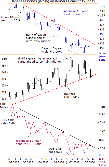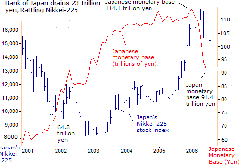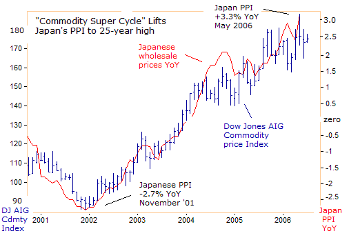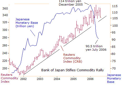 Bank of Japan Tightening despite Oil Shocks The Bank of Japan's five-year, ultra-easy money policy was widely cited as a primary contributor to the bullish trend in global commodities, including copper, crude oil, silver, and zinc, over the past four years. The BOJ's ultra-easy money policy boomeranged with higher energy and metals costs, pushing Japan's producer price index up 3.3% in May from the same period a year earlier, its fastest in 25 years. According to the Bank of Int'l Settlements, in the seven quarters to the end of 2005, “yen carry” trades surged by $161 billion, with three quarters of this lending channeled to international financial centers such as the United Kingdom, Singapore, and the Cayman Islands, a favorite haven for hedge funds. Traders could borrow funds in Japan at zero percent to finance positions in commodities, while the Japanese ministry of finance was intervening or jawboning the yen lower.