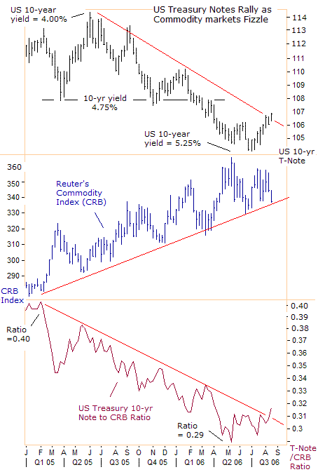 Since the Reuters CRB index topped out at the 365-level on May 11 th , the US T-Note-to-CRB ratio bottomed out at the 0.29-level, and has since turned higher towards the 0.3170-level. With the US T-Note-to-CRB ratio penetrating its downward sloping trend-line, US bond bulls are expressing supreme confidence that the US fed funds rate and 10-year yields have both peaked at 5.25%, and that the good-old days for the “Commodity Super Cycle” are fading into history.
