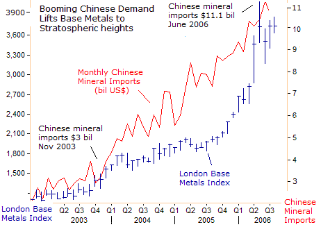 China's economy is riding a boom in exports and fixed-asset investment in factories, roads and housing, and has repeatedly defied expectations of a slowdown. Industrial production was 16.7% higher in June from a year earlier, as it becomes the world's manufacturing base, due to cheap labor and low taxes. Already, imports of minerals reached an all-time high of $11.1 billion in June, quadruple its demand from just three years ago. Base metal supplies are extremely tight, and high prices are boosting the fortunes of metal miners in Australia, Brazil, Canada, and Russia. China is the key engine of growth in Asia. Australia's exports to China soared 42% in the ten months to April 30 th from a year earlier, thanks chiefly to a 22% jump in exports of metal ores and minerals. Japan's exports to China jumped 26.1% to 4.9 trillion yen in the first half of 2006. Korean exports to China, which were growing at a rate in excess of 50% during 2004 and into 2005, have slowed to a pace of 12% in the first half of 2006.