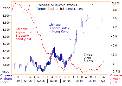 A hard landing in China would send tremors throughout Asia and rock far away places such as Germany, whose exports to China rose 28.1% in the first five months of 2006. But Beijing's leaders are moving cautiously, and simply aim to fine tune the economy towards a 10% growth this year. Still, the latest hike in Chinese interest rates would attract more “hot money” to the yuan, so the next phase of PBoC tightening might center on a yuan revaluation to 7.75 against the US dollar, a bullish factor for commodities in the longer term.