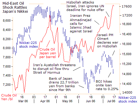 The flare-up of violence briefly sent US light crude oil soaring to record highs of $78.40 per barrel on July 14 th , and crude oil for April 2007 delivery hit $80 per barrel. Iran's Ayatollah figures the US or Israel might someday launch a preemptive strike again his nuclear facilities. So Hizbollah's attacks might just be a sneak preview of the damage that Tehran can inflict on Israel and the global stock markets, if the UN embargos Iranian oil exports or blocks its imports of gasoline. Fanning the flames of a wider war in the Middle East, on July 13 th , Iran's Ahmadinejad warned Israel against attacking Syria, during a telephone call with President Bashar al-Assad in Damascus. "If Israel commits another act of idiocy and attacks Syria, this will be the same as an aggression against the entire Islamic world and it will receive a stinging response,” he warned.