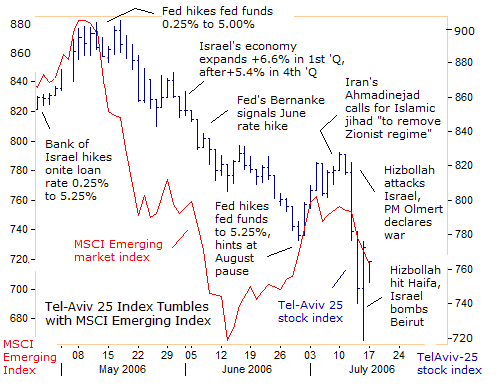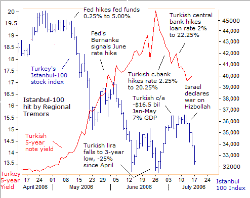 Istanbul swept lower by Regional contagion The main Turkish share index, the Istanbul-100 fell as much as 4.8% on July 17 th , while the lira and Turkish bonds weakened with losses in other foreign markets. Violence between Turkey's southern neighbors in Israel and Lebanon has escalated, increasing investors' fears that the situation could erupt into regional violence. Tourism to Turkey was already 16.7% lower in May from a year earlier. The Turkish stock market was hammered in the global emerging stock market meltdown between May 11 th to June 13 th . The lira tumbled by 25%, forcing the central bank to hike its overnight lending rate in rapid succession by 425 basis points to 22.25%. The weaker lira is expected to lift Turkey's 10.1% inflation rate in the months ahead, and put a strangle hold on the Turkish stock market.
