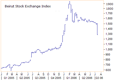 These types of organizations were eliminated in the US in the 1930's, through a series of restrictions on ownership, as well as double taxation of dividends paid by a company to its parent organization. As for the future of the TA-25, Israeli traders are already looking beyond the skirmish in Lebanon and focusing on fundamentals, such as interest rates, oil prices, earnings, and the direction of other emerging stock markets. Israel's military said it destroyed 30% of Hizbollahs's weaponry so far, and expects to knock out the remainder by next week, leading to the departure of Sheik Nasrallah from Lebanon. Beirut Stock Exchange Locked Limit down Lebanon's stock market did not open on July 17 th , after tumbling 14% last week, after the Israeli blockade closed down the Lebanese economy and all its foreign trade. Lebanese Finance Minister Jihad Azour explained the market would be closed for security reasons, though trading would continue in the Lebanese pound. On the currency front, big investors are converting to the US dollar from the Lebanese pound, but so far, there has been no major flight of capital.