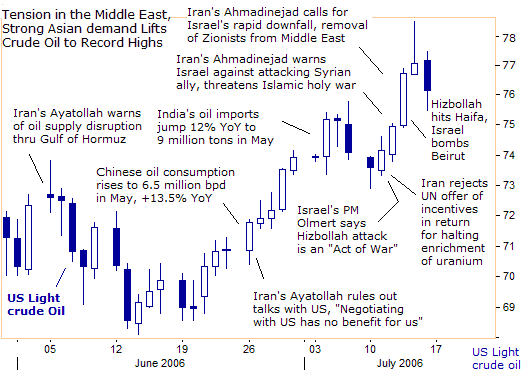 Fears of a Wider War in the Middle East Very few traders took Iranian President Mahmoud Ahmadinejad seriously on July 9 th , when he called for a jihad against Israel. “The basic problem in the Islamic world is the existence of the Zionist regime, and the Islamic world and the region must mobilize to remove this problem. The biggest threat today for the region is the existence of the fake Zionist regime, and it will not be long before intense Muslim fury will lead to a huge explosion," he said. Three days later, on July 12 th ,