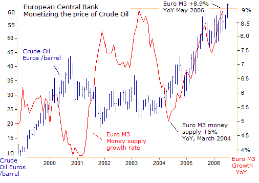The sharp rise in world oil prices presents a big dilemma for the European Central Bank, which is inflating the Euro M3 money supply at an annualized 8.9% clip, to cushion the European stock markets from the rising costs of energy. The ECB's strategy is beginning to backfire, with European headline inflation rates creeping higher, due to the rising cost of oil and its secondary knock-on effects. On June 15 th , the Bank of Spain's chief Jaime Caruana broke ranks with ECB chief Jean Trichet, and called for a tighter ECB monetary policy to combat the rising cost of energy and other commodities. “The world economy has so far absorbed rising commodity prices well, but the upwards trend is a major risk to the world economy,” declared Bank of Spain chief Jaime Caruana on June 15 th . "This trend constitutes a risk of the first order to which monetary policy must remain vigilant”