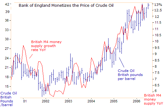 So on the surface, the ECB is raising nominal interest rates, but behind the “smoke and mirrors” the ECB's repo rate, adjusted for producer price inflation, is actually lower this year, at a negative 3.25 percent. An August rate hike to 3.00% would still leave the ECB far behind the inflation curve, especially during a Middle-East oil shock period. But then again, the ECB is also aiming to cushion European stock markets. Bank of England Monetizing Oil prices The Bank of England, has been conspicuously absent from the G-10's monetary tightening campaign this year, Instead, the BOE is quietly inflating the British M4 money supply at an annualized rate of 11.7%, twice the growth rate from three years ago, to insulate the British stock market from the shock of escalating oil prices. England finds itself today with crude oil prices at 42 pounds per barrel, up 133% from three years ago, yet the BOE has no intention of raising rates anytime soon.
