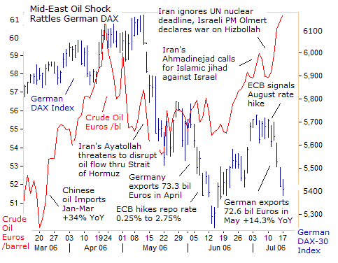 Bernanke has zig-zagged a few times in the past three months, between calls for a pause, then calls for rate hikes, to confront inflation pressures. After the latest downturn in the US stock markets, the odds in the fed funds futures market are 50-50 for a rate pause in August. European Central Banks Shaken by Middle-East Oil Shock Just when Europe's largest economy was gaining upward momentum after 3-years of flirting with recessions, the Middle-East oil shock threatens to derail Germany's long awaited recovery. German factory orders jumped 17.3% from a year earlier in May, the biggest increase since 2000. The Munich-based Ifo institute raised its 2006 growth forecast for the German economy to 1.8% and the business confidence index unexpectedly surged to a 15-year high. Germany's $2.6 trillion economy and the DAX-30 blue-chips have depended on foreign sales over the past four years for growth, as job cuts at home and a surge in oil prices eroded households' purchasing power. About one third of Germany's overall economy is linked to exports, which were booming in April and May at an average of 73 billion Euros, but are at risk from any global economic downturn.