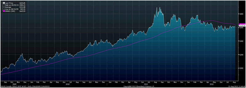 Gold Spot $/oz and 200 Day Moving Average - August 2009 to Today - (Bloomberg)