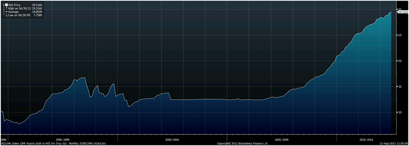 Since 2006, Russia has been gradually accumulating gold in order to diversify and protect from devaluation of their dollar and euro foreign exchange reserves and as part of a long term plan to position the Russian rouble as an international reserve currency