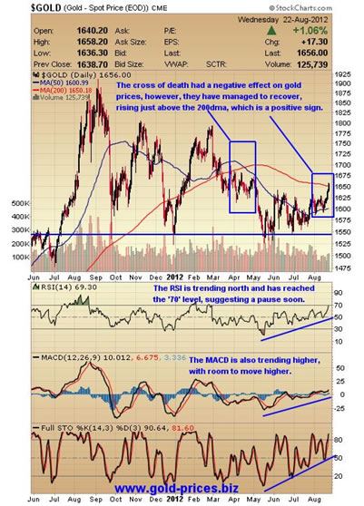Before we conclude we will take a quick look at the chart where we can see that the RSI is trending north and has reached the '70' level, although it can go higher the penetration of this level suggests a pause may be on the way. The cross of death had a negative effect on gold prices, driving them lower, however, they have managed to recover, rising to just above the 200dma, which is a positive sign. Also note that the MACD is also trending higher, with room to make further progress. What we would like to see next is the 50dma cross over the 200dma in an upward swing, that would signal that a serious rally was underway, in our very humble opinion.