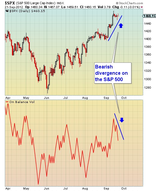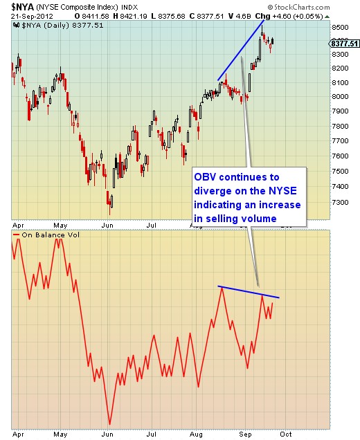 For example, during this last advance in September, On Balance Volume (OBV), a measure of buying and selling pressure, has indicated that there was a clear decrease in buying pressure during this rise. The NYSE rose to a new high whereas the OBV dropped lower.