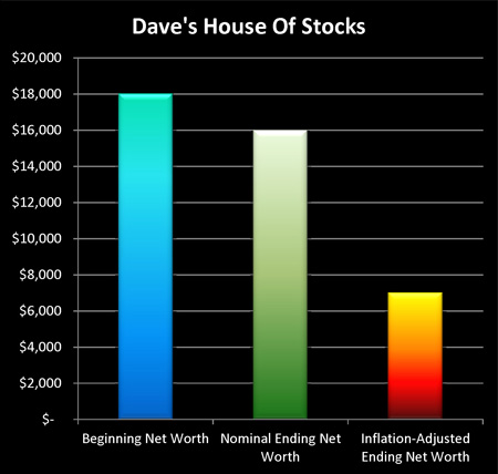 By 1982, after ten years of inflation, the dollar was only worth 43 cents in terms of 1972 dollars. So when Dave took his $16,000 ending value in 1982, and converted it to constant 1972 dollars, he found that his ending stock value was only $7,000. In real terms, Dave had managed to lose $11,000 of his $18,000 starting investment – meaning a real loss of 62% – by relying on common stocks to beat inflation.