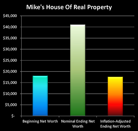 Now, this is not to say that Mike did poorly. He almost maintained the real value of his investment during the most powerful bout of inflation in recent American history, and unlike his two brothers, he did have a place to live for ten years without making mortgage or rent payments, which freed up money that he could have then used for investing. But owning the house itself on a debt-free basis did not directly make him money in inflation-adjusted terms.
