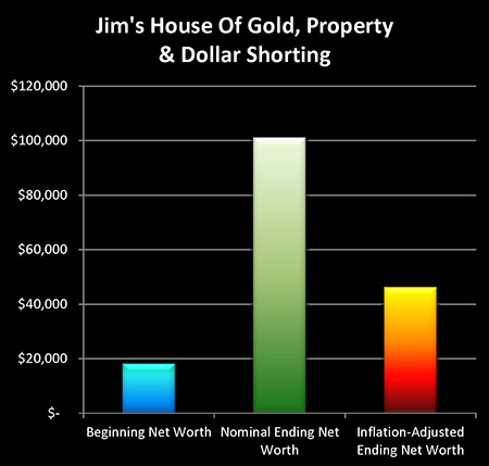 When we add these up, we find that Jim’s net worth had climbed from $18,000 up to about $46,000 in real terms, giving him an inflation-adjusted total return of about $28,000 (155%) over the ten years of sustained inflation. Jim simultaneously went long the real and short the symbol, and when the symbol (the dollar) then had a loss of confidence and plunged in value – Jim’s net worth soared as a direct result.