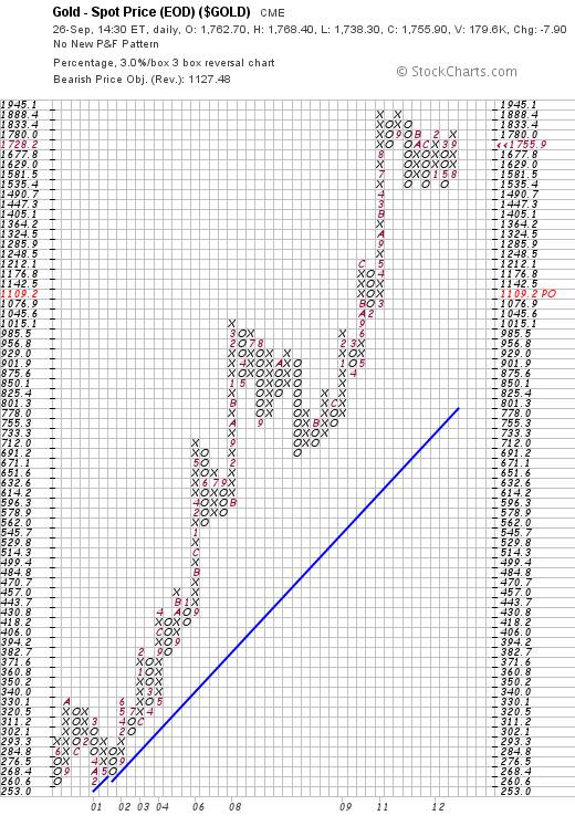Despite all the optimistic noises regarding recent movements of the gold price, the chart below (3% X 3 box reversal Point & Figure chart, courtesy stockcharts.com) is still showing $1109 as the prevailing target price. The gold price will need to rise to $1833 for that target to be negated.