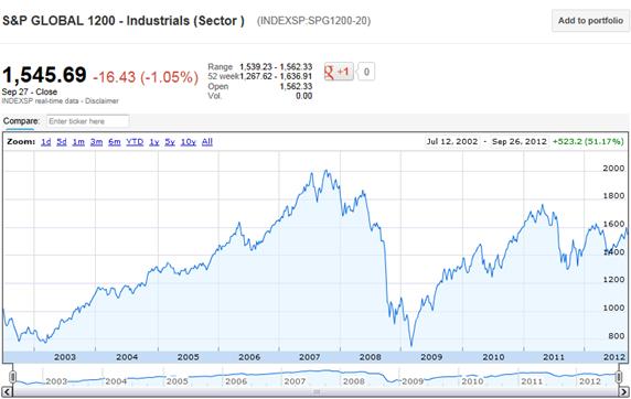 Below, courtesy Google is the S&P Global 1200 Industrial Chart up to September 26th 2012 (Source: http://www.google.com/finance?cid=10264130 )