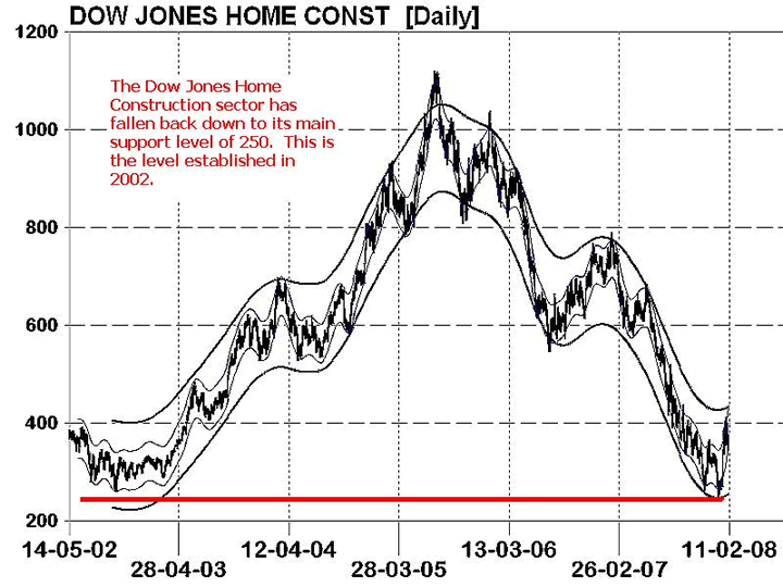 Both of these groups have staged a waterfall drop down to a price level not seen in over four years. The Housing Index (Chart 1) has sunk to the October 2002 line of 118 and the Dow Jones Home Builders sector (Chart 2) has spiraled downward to 250. Both indexes have wiped out all of their growth for the past four years.