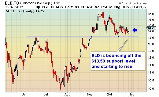 Eldorado Gold (ELD) in chart 2 is another mid-level gold producing company with a strong balance sheet. In October, ELD fell down to the main support line of $13.50. Over the last couple of days investor interest has started to build.