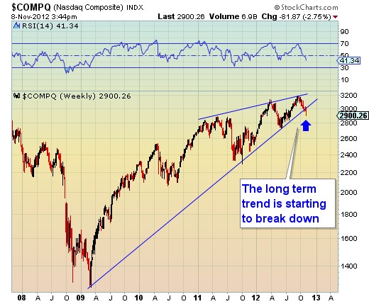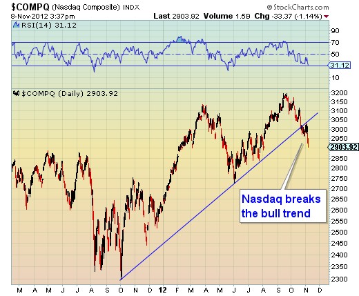 The high-tech Index began trading below its main trend line in late October (Chart 1). This line is significant. It has held Nasdaq since March 2009 (Chart 2).