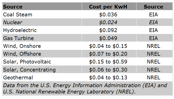 "Renewable" energy sources are popular to discuss, but the only viable one is hydroelectric power. And as the table shows, it's more than four times as expensive to operate as a nuclear power plant. Wind and solar are unproven as mainstay sources of power for a national power grid... and are incredibly expensive to build and maintain.