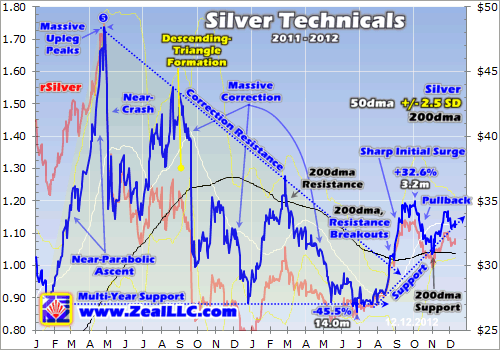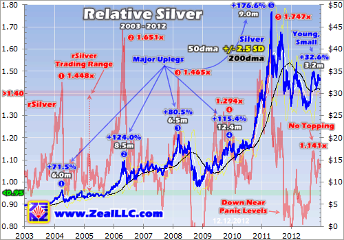 The chart above shows Relative Silver, or rSilver, in light red. Since the early days of its secular bull way back in 2003, the rSilver trading range has run between 0.95x to 1.40x. At the support end when silver is trading near or under 95% of its 200dma, it is oversold and a fantastic buy. Note above on the chart how silver surged in new uplegs soon after such low oversold extremes were reached. Silver was too cheap.
