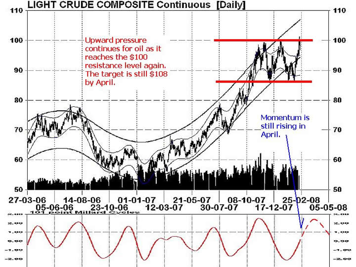 Investment approach: Supply/demand numbers clearly illustrate that oil will be advancing over the years to come. Technical models point to short-term consolidation above the main $85 support level (see Chart 1) and moving through the $100 resistance line, towards its first target of $108 by the second quarter of 2008. The second higher target of $115 is anticipated by the peak in the driving season (July & August).