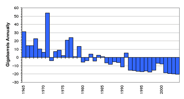 Chart 2 illustrates oil discovery (new supply coming on-stream) versus global consumption. The peak in the supply/consumption ratio was in the 1960s. For over 40 years, the line has continued to fall, as demand has rapidly outstripped existing and newfound oil. The crossover into the new reality of lower reserve levels developed in the mid-1980s. As of 2007, over 22 gigabarrels (22,000,000,000) are being consumed per year over existing supply.