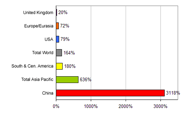 Though the U.S. is still the largest oil consuming nation, soaring new demand has largely come from the Asia/Pacific region and especially from China. Chart 4 shows the percentage of new growth as compared to other regions of the world. China is up over 3,000% in the last three years and with the trend steadily escalating.