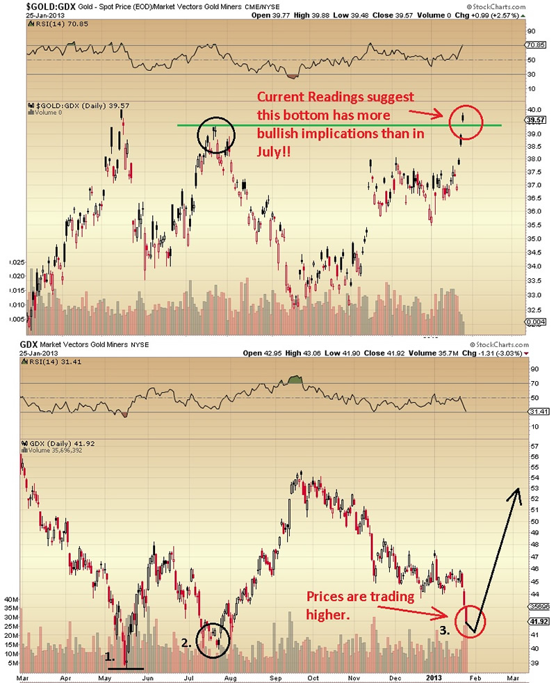Elevated readings of the ‘Gold to Miners ratio’ have a credible tendency to mark important bottoms. Readings, especially this past week, certainly justify the current climate as not only bottom worthy, but very stretched-- while holding safely above the “July lows”.