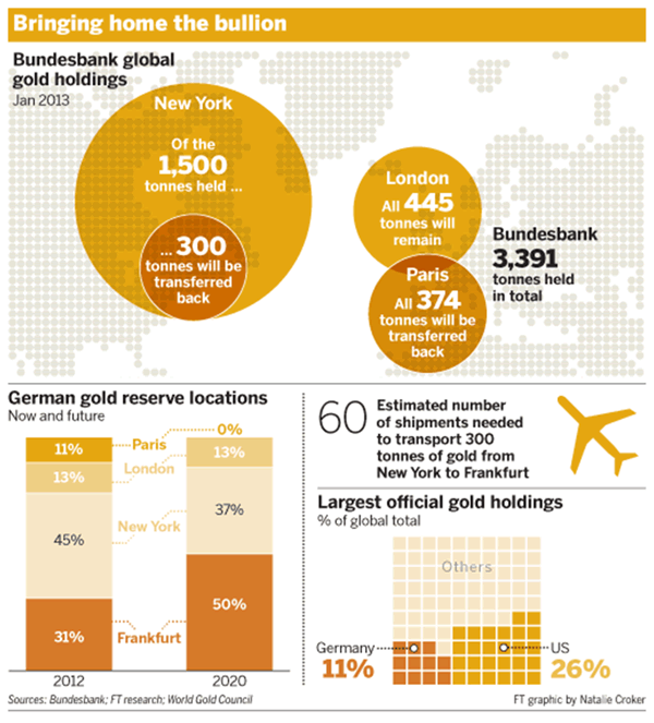 Bundesbank announced last week that they'll repatriate 674 metric tons of their total 3,391 metric tonne gold reserves from vaults in Paris and New York to restore public confidence in the safety of Germany's gold reserves. The transfer from the Federal Reserve is set to take place slowly over a seven year period and will only be completed in 2020.