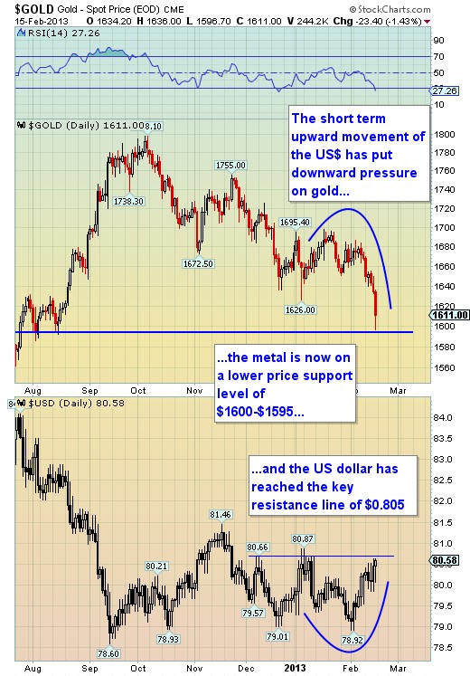 Bottom line: The trigger for gold's recent drop appears to be the rise in the US dollar. This was brought about by the current consolidation/correct in world markets. However, these upticks in the dollar are generally short lived and usually only last a few weeks. The dollar remains in a long term downward trend.