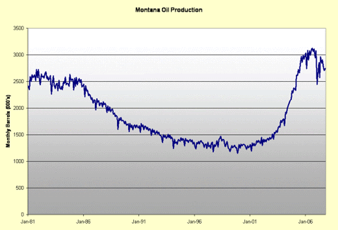 The chart shows that Montana's oil production looked to be tailing off sharply in the late '90s. But when producers began targeting a particularly productive field within the Bakken, production soared to new highs.