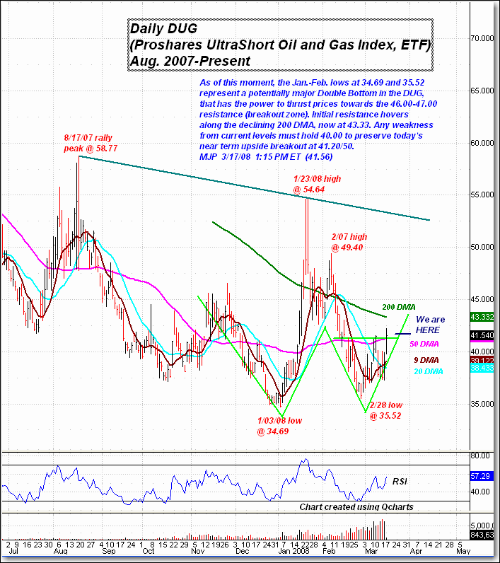 As of this moment, the Jan-Feb lows at 34.69 and 35.52 represent a potentially major double-bottom in the DUG that has the power to thrust prices towards the 46.00-47.00 resistance (breakout zone). Initial resistance hovers along the declining 200 DMA, now at 43.33. Any weakness from current levels must hold 40.00 to preserve today's near-term upside breakout at 41.20/50.