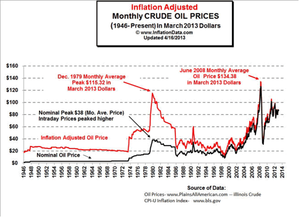 First we can note that the oil price compression from the 1979 peak took 7 full years, to 1986, to fall by the same percentage amount it lost in only six months in 2008-2009. In nominal terms, we had a fall from over $125 a barrel for both WTI and Brent in June 2008, to just above $30 in February 2009, then a rebound to over $100 a barrel in April 2011.