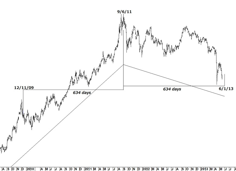 Point E counts 634 calendar days to the intra-day high of the basic cycle on 9/6/11. Counting an equidistance forward in time targets a low on Saturday, June 2 – leading me to expect a tradable low in gold on either the previous Friday or following Monday.