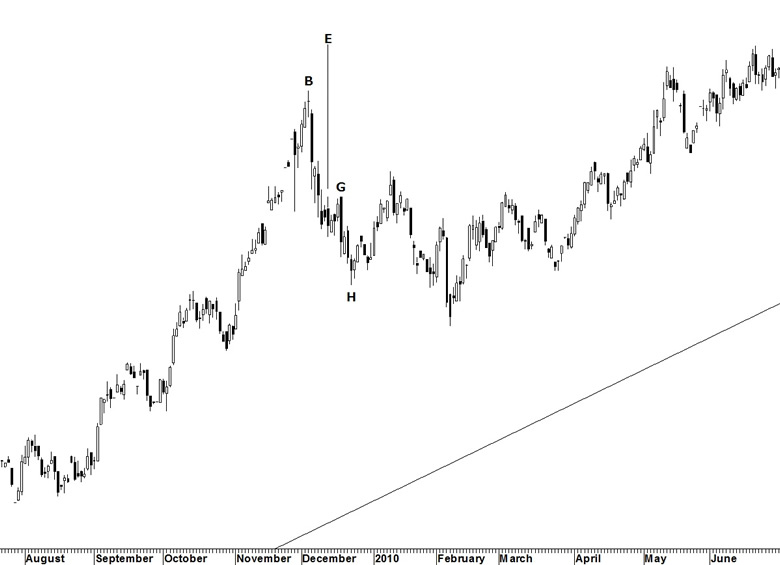 The February article illustrated a 48-week cycle which pointed to a turn in the price of gold in mid-May. Cycles expand and contract and this one is no exception often expanding to as long as 50 weeks. To narrow the forecast time period we can use the middle section model. The concept of a descending middle section was developed by George Lindsay and is essentially a decline (B to H) in a long bull market interrupted by two small rallies (E and G) at about the same level. Point E, the first of the two rallies, is called the “measuring point”. In the December 2009 middle section, point E falls on December 11.