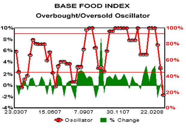 This situation is reflected in this week's chart. Plotted with red circles is a simple stochastic oscillator on our Base Food Index. That index is comprised of the cash prices of 13 major Agri-Food commodities. The straight red lines are mean value of oscillator plus or minus the standard deviation. Most recent reading is well below the statistical relation that has existed for some time. A correction in Agri-Food price could be developing, and it may last for several weeks. This period should be used for investors to begin or add to positions in Agri-Food investments.