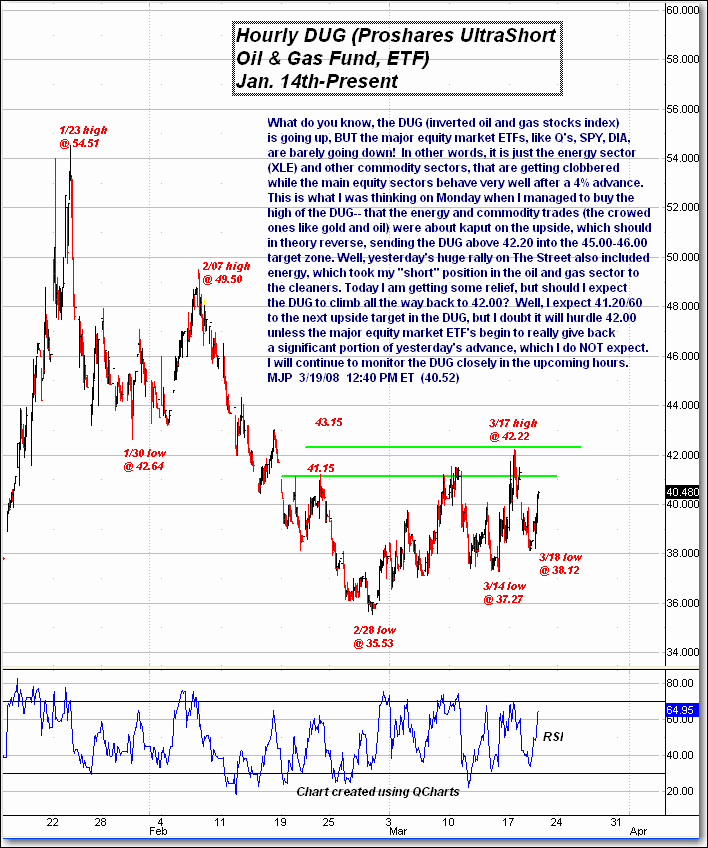 What do you know, the ProShares UltraShort Oil & Gas ETF (AMEX: DUG) is going up, but the major equity market ETFs, like Q's, SPY, DIA, are barely going down! In other words, it is just the energy sector (XLE) and other commodity sectors, that are getting clobbered while the main equity sectors behave very well after a 4% advance. This is what I was thinking on Monday when I managed to buy the high of the DUG-- that the energy and commodity trades (the crowed ones like gold and oil) were about kaput on the upside, which should in theory reverse, sending the DUG above 42.20 into the 45.00-46.00 target zone.