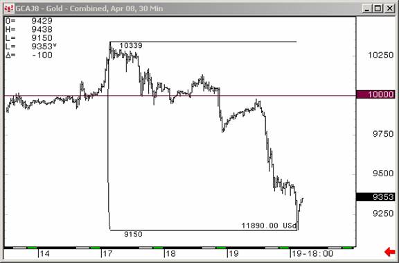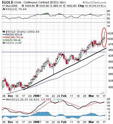 No, it was hot money taking shelter against the sinking dollar, which was getting bashed by the Fed's bailout of the housing and credit markets. Sentiment had become overly bullish as gold approached and penetrated $1000/oz. Ironically the reversal comes on a .75 bps cut in the overnight rate, but such are market tops, and TTC members anticipated this as well. With the Street expecting as high as a 1.25% cut the actual cut with heightened anti-inflation rhetoric was actually a bit of a return to sanity from the Federal Reserve. This boosted the dollar and forced the liquidation of a whole lot of dollar hedges in precious metals.