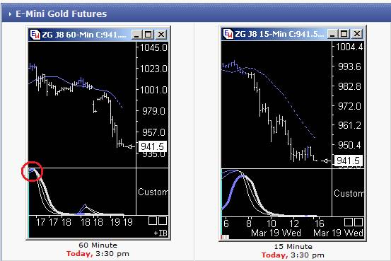 Of course spotting a top can be very lucrative, but should only be done with extreme caution and confirmation from several different methods. One useful indicator in catching this reversal in gold was the proprietary TTC trend cycle charts. Notice the 60-min chart above on the left finally rolled on the Tuesday, catching a fair majority of the decline to date. The faster moving 15-min chart on the right completed a low to high cycle during the choppy trading, providing a temporary short-covering or long scalping opportunity for the fastest traders.