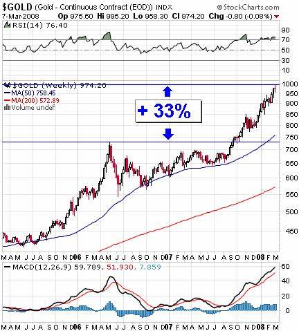 Answer the question for yourself. When the Fed announced last week it would accept mortgage-back paper as collateral, it essentially threw down the gauntlet and made a commitment to engage the credit crisis. This game changer alone was enough to have me limit my target in gold to roughly the $1000 range. Should the European economy falter relative to the U.S. economy, and especially if the ECB is compelled to cut interest rates, the intermediate term prospects of dollar-denominated gold will diminish. But, recent history tells us that last time the Fed funds rate was this low gold didn't start rising rapidly until after signs of recession were gone and the waves of inflation started by the low interest rates began to wash up in global markets. It's unlikely the ECB will begin anything like the dramatic rate slashing regime of the Fed, or that the rest of the world will decouple from the U.S. market.