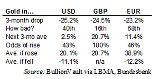 Over the last 45 years, when gold has dropped this much or worse in three months, it has typically rallied hard over the following four weeks. Better than four-fifths of the time in fact, with an average one-month rise of 11.1%. On those occasions when gold fell and extended its loss, however, the average drop for Dollar investors who held on was 5.3%.
