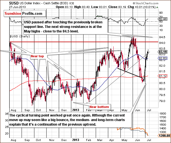 In this week’s USD Index short-term chart, we can see how the situation has evolved recently. A sharp rally was seen recently so a pause would not be surprising. As odd as it may sound given the previous sentence, a continuation of the rally is also a possibility. The upswing is pretty symmetrical with the preceding decline, and if this continues, we could see a move above 84 in the coming days. This would likely have severe bearish implications for gold and silver. Taking a closer look, it seems that higher USD values in the past few days drove gold and silver prices lower, so a move above 84 would surely be a big deal for the whole precious metals sector.