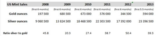 Silver bullion sales are constantly breaking records, high premiums over spot are not fazing buyers. Sales of silver coins by the U.S. Mint (one of the world’s top producers of gold and silver coins) have set a record high in the first half of 2013. That’s the best start to a year…ever.