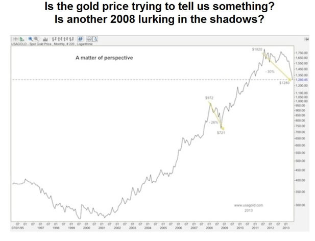 “This monthly gold chart is drawn on the logarithmic scale in order to remove some of the melodrama to the latest correction. Linear charts emphasize nominal price movement while a log chart emphasizes the percentage movement. By reviewing gold’s latest correction on a percentage basis, we can put things into a little bit better perspective. The 2008 correction was 26%; the current correct thus far has been 30%. In short, we’ve been here before…” Michael J. Kosares