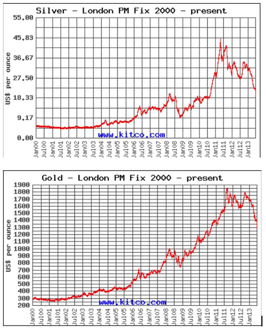 From January 2000 gold went from $300.00 per ounce to almost $1,900.00, while silver, in the same time period went from roughly $4.50 to almost $46.00. As you can see from the above charts the bulk of gains were captured from the end of 2008 to the peak prices, in both gold and silver, in the summer of 2011. Gold’s gain from roughly $750.00 to $1850.00 was impressive but even more impressive was silver’s gain – from just over nine bucks to $46.00.