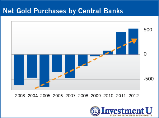 That, my friends, is a bullish trend. Global central banks purchased a net of 534.6 metric tons of gold in 2012, up from 456.8 the previous year, according to the World Gold Council.