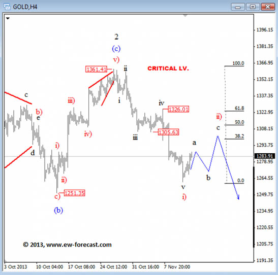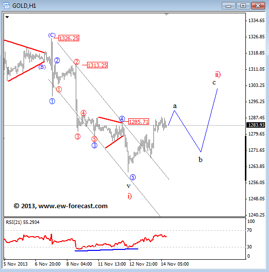 GOLD retraced back to 1285 highlighted yesterday after completed five waves down, followed by a recent push out of a downward channel which we think is causing wave a up, first leg of a three wave rally in wave ii).