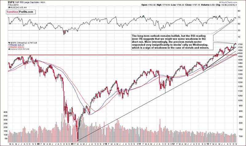 Taking into account the relationship described above, it seems important to discuss the current situation in the general stock market. The weekly chart of the S&P 500 index was featured in our latest Premium Update and you will find it below, along with a quote from today's Market Alert: