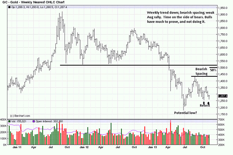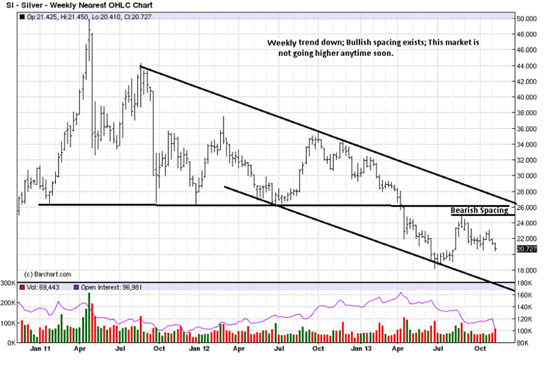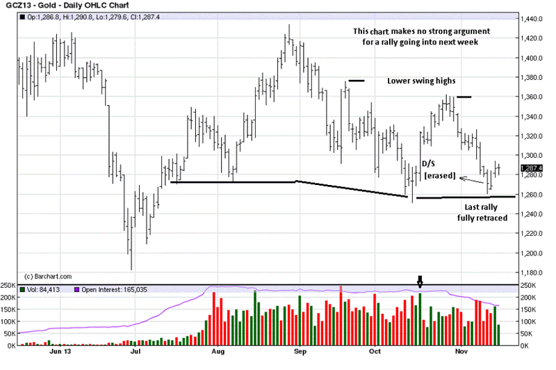 The fact about the daily gold chart is that it continues to make lower highs, and that is a characteristic is a down trending market, so the message here remains clear. There was a high volume strong rally in mid-October. The bar is marked "D/S," Demand over Supply. This positive expression of demand was erased by the 4th bar from the right. Another fact is that the October rally effort was totally retraced, last week. Both are signs indicating the weak character of the gold market.